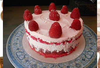 Ingrédients pour le biscuit génoise :4 œufs125 gr de sucre glace40 gr de farine60 gr de fleur de maïs (Maïzena)1/2 sachet de levure sèche1 pincée de sel (personnellement je n'en mets pas car régime sans sel ou presque oblige) Un peu de colorant rougeVous pouvez si vous le souhaitez parfumer votre génoise en ajoutant par exemple de la vanille.Ingrédients pour la mousse :400 gr de framboises (vous pouvez employer des brisures de framboises) + des framboises pour la décoration80 gr de sucre3 feuilles de gélatine250 gr de crème fraîche épaisse50 gr de sucre glace Pour la génoise : faîtes chauffer votre four th 5/6 soit 170°/180°. Faire blanchir les jaunes d’œufs avec le sucre (votre mélange sera prêt lorsque vous parviendrez à faire le "ruban").A l'aide de votre robot pâtissier montez les blancs en neige avec l pincée de sel et le colorant rouge puis réservez quelques minutes.Parallèlement mélangez la farine, la maïzena et la levure puis tamisez-les pour éviter les grumeaux. Mélangez délicatement la farine/maïzena/levure à vos œufs puis incorporez très délicatement les œufs en neige à votre base. Votre préparation doit être mousseuse et aérienne.
