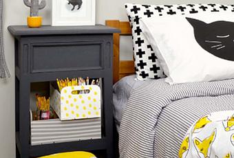 - Optez pour du linge de lit noir en hésitant à mixer différents motifs ! On complète avec quelques coussins jaunes.