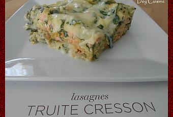 Pour 6 personnes : 12 feuilles de lasagnes (4 couches de 3 feuilles), 500 g de truite (ou de saumon), 200 g de cresson, 1 citron vert, 1 gousse d'ail, 1 échalote, 1 pincée de baies roses, 100 g de mozzarella, huile d'olive, sel, poivre