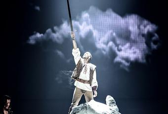 Dans le spectacle l'accent est mis sur le triangle amoureux entre Arthur (Florent Mothe), Guenièvre (Camille Lou) et Lancelot (Charlie Boisseau) et sur la vengeance de Morgane (Zaho).Le spectacle commence dès l'entrée dans la salle, des enfants sont emmenés sur scène par des druides pour tenter d'enlever Excalibur du rocher et miracle un petit blondinet à réussi et est reparti avec l'épée. Et puis la lumière s'éteint, on nous invite à faire taire nos téléphones et Merlin apparait. Le fond de la scène est un écran géant, les images projetées sont souvent un peu kitch, mais d'une qualité parfaite. J'ai adoré le jeu de scène avec les "portes" coulissantes et les rideaux qui permettaient de dissimuler plus ou moins l'arrière scène. Gros coup de coeur aussi pour tous ces danseurs qui apparaissent dans le public alors qu'on ne s'y attend pas.