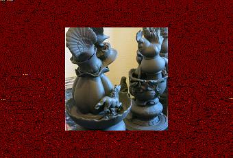 Il y a là, réunis contre leur volonté, le cygne pompeux, le cheval au galop, la tête d’ange, le cache pot tarabiscoté, le faux coquillage, le pot de chambre, le coq prétentieux, la déesse dénudée, la sotte petite théière etc…(il ne manque que le raton laveur). Et les pieds des petits meubles sont imbriqués dans des récipients hétéroclites. « Les pieds dans le plat » dit l’artiste! Car, l’humour et la dérision ne sont jamais loin.