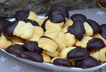 Dès que les spritz sont refroidis, faire fondre le chocolat noir au bain-marie. Tremper chaque spritz dans le chocolat pour en couvrir une moitié.