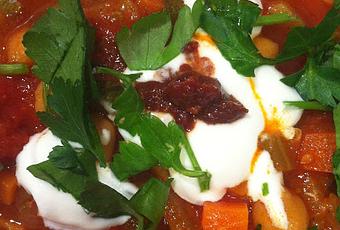 Au moment de servir, déposez votre une demi ou entière cuillère (selon les gouts!) à café de harissa et une cuillère à soupe de yaourt dans chaque bol et parsemez des feuilles de persil plat.Enjoy! Bises!