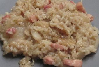 Ajouter le riz, les lardons et le thym, mélanger jusqu'à ce le riz devienne transparent.