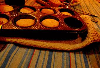 Alors que le moule à muffin chauffe dans le four à 425 avec un "dé" de beurre végétal pour chaque "pudding", on prépare la mixture qui sera versée dans le moule bien chaud et qui va comme suit;