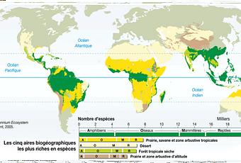 Des milieux particulièrement riches en espècesDe 1 à 10 millions d’années, selon les groupes : c’est la durée de vie d’une espèce, estimée par la paléontologie, dans des conditions normales, stables, de biodiversité. Mais, avec la suprématie d’Homo sapiens sapiens, ces conditions sont largement perturbées, et il semble peu probable que les espèces puissent se perpétuer aussi longtemps.Car l’être humain, à force de confondre l’utilisation de la nature et sa prédation, détruit le vivant de plus en plus largement, et de plus en plus rapidement. Les taux d’extinction actuels des espèces, rapportés à ceux qui existaient aux temps géologiques anciens, sont de 100 à 1 000 fois supérieurs (et parfois plus). Les menaces traditionnelles d’origine anthropique que représentent la destruction des habitats et la surexploitation sont renforcées par les invasions biologiques, les pollutions, les bouleversements climatiques (et, d’une manière générale, par l’altération des cycles biogéochimiques) et la surpopulation humaine.