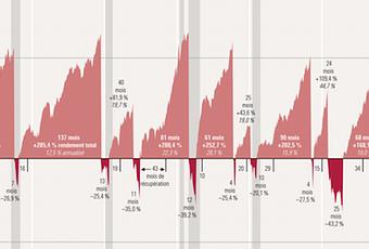 Ça tout l’air que le marché haussier (bull market) s’essouffle. On peut même dire que le marché canadien est officiellement en territoire de correction. Ce sera probablement le cas bientôt pour le Dow Jones et le S&P 500. Mais rappelons que les marchés baissiers font partie de la norme des cycles économiques. La bonne nouvelle? Ils sont moins prononcés que les marchés haussiers et surtout, durent moins longtemps. Les plus prononcés ont duré environ 2 ans et ont engendré un repli allant jusqu’à 43%. Pour ce qui est des marchés haussiers, il y a eu des séquences dépassant 10 ans cumulant jusqu’à 285% de gains. C’est pour ça qu’à long terme il faut rester investi. On ne sait jamais quand une forte journée de rebond changera le rendement final de l’année en cours. Vous souhaitez amoindrir les effets des baisses, alors la véritable gestion active (dont les titres et proportion sont +de 70% différents des indices) vous sera de grand secours.