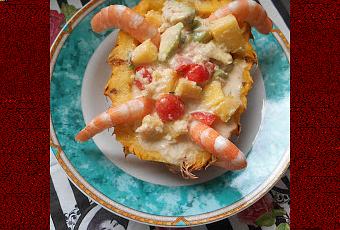 Pour 4 personnes :2 petits ananas Victoria (ce sont les plus parfumés)150 gr de crevettes à décortiquer (soit environ 8 crevettes)1 boîte de crabe émietté1 échalote5-6 petites tomates cerises1 avocat citronnelle (facultatif)1 citron vertdu pimentsel 2 c à s de mayonnaise1 yaourt à la Grecque (pour alléger le plat)