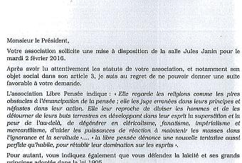 Denis Collin écrit : « Évreux : La mairie vient de refuser à l’association la Libre Pensée une salle au motif que la Libre Pensée étant hostile aux religions lui prêter une salle contreviendrait à la loi de 1905. Le monsieur responsable de cette argutie ignore que les principaux initiateurs de la loi de 1905 (dont Aristide Briand) étaient d'éminents membres de la Libre Pensée. Mais passons: il ne faut pas demander de la culture historique à un élu…inculte !