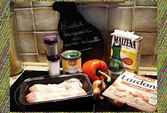 . Ajoutez dans l'ordre, les pilons de poulet, les lanières de poivron, les lardons, la pulpe de tomates, le thym et le contenu du shaker