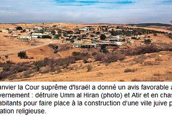 Il y a une semaine, on apprenait qu’Israël allait annexer 150 hectares de terres en Cisjordanie, une expansion qui semble n’avoir aucune limite, aucune fin, et ne rencontrer aucune obstacle, malgré le franchissement permanent des conventions internationales que cet acte de terrorisme de fait constitue. Aujourd’hui, l’Huma nous apprend que 2 villages du Néguev vont être détruits :