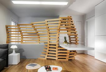Destiné aux locations de courtes durées, cet appartement accueille un système de claustra et de rangements sur mesure. Une structure aérée et enveloppante composée de 131 pièces de hêtres qui sépare astucieusement la cuisine du séjour sans l’enfermer, laissant la table à manger en porte-à-faux assurer le rôle de pont entre les deux espaces d’activité. Ce système de claustra se trouve dupliqué dans la chambre pour abriter les tables de nuits et un éclairage intégré. Le gain de place est encore maximisé par l’intégration des placards de rangements contre les murs (dont un lit d’appoint rabattable et un bureau). Un meuble de rangement tout hauteur là encore sur mesure dont la surface gravée assurent un léger relief.