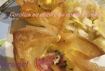 Ingrédients pour 8 corolles (4 au chèvre et 4 au comté) : 4 feuilles de brick rondes - 40g de beurre fondu - 4 tranches de bûche de chèvre - 60g de comté - 6 tranches de bacon - 2 oeufs - 20 cl de crème fraîche liquide - 1 cs de ciboulette hachée - sel - piment d'Espelette