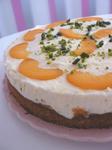 Sur la base de dacquoise, étaler les abricots cuits puis la mousse et faire prendre au congelo 1 heure minimum. Couper l'abricot restant en fines lamelles et décorer le gâteau, j'ai également ajouter des pistaches concassées. Avant de servir, retirer le cercle délicatement soit à l'aide d'un sèche cheveu ou d'un chalumeau.