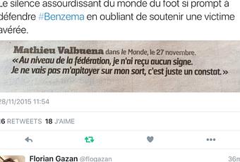 Et pendant ce temps, rien pour Valbuena. La victime. Si ! Ce même président de la FFF, le socialiste Noel Le Graet, qui a dit que Valbuena n'aurait pas "du laisser trainer son téléphone portable". Certains disent que c'est la faute des filles qui mettent "des vêtements inappropriés" si elles se font violer. Noel Le Graet n'a juste rien dit de différents.