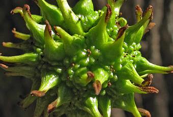Liquidambar styraciflua (Liquidambar, Copalme d'Amérique) : Une gomme résineuse qui s'écoule de son écorce (Baume blanc du Pérou) a été autrefois utilisée en médecine traditionnelle, en parfumerie, en particulier par les embaumeurs des momies en Égypte, et dans l'industrie alimentaire pour fabriquer les premiers chewing-gums. Cette résine contient du styrène, molécule isolée puis synthétisée par l'industrie chimique au XIXème siècle, qui donne par polymérisation le polystyrène, matière plastique aux emplois multiples, non-biodégradable mais recyclable.