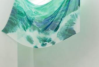 D’où, certainement, le choix du premier terme de l’exposition, « Opaline », dont la définition « vert pâle et laiteux tirant sur le bleu » s’applique à la couleur des eaux caribéennes. Celles-ci seront poétiquement représentées, d’une part, par de grandes pièces de soie peintes, tendues au plafond et spécialement conçues aux dimensions de la pièce. Et, d’autre part, par une coulée de peinture s’échappant de la rue pour s’infiltrer dans la galerie, depuis la porte d’entrée. Jouant de cette extension entre le haut et le bas qui repousse les murs, l’artiste procède ainsi au positionnement des Eaux primitives à partir desquelles il placera au sol une Terre, ou plutôt un continent englouti, l’Amérique pré colombienne. Au moyen, symboliquement, d’un tapis dont les laines ont été teintes et tissées au Mexique selon des techniques ancestrales.