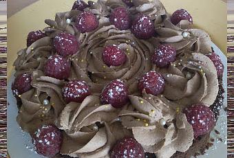 J'ai pris la recette du fondant dans le "Petit Larousse de la Pâtisserie". Comme le gâteau n'est pas très épais je l'ai agrémenté d'une chantilly au cacao et de framboises fraîches et ça faisait plus fêtes aussi. Petit plus pour les intolérants au gluten, le fondant ne contient pas de farine. Go !