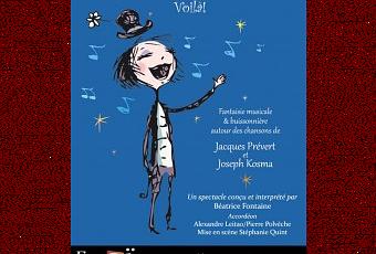 Spectacle conçu et interprété par Béatrice Fontaine Une fantaisie musicale et buissonnière autour des chansons de Jacques Prévert et de Joseph Kosma.