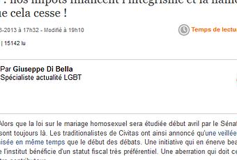 sourceVoir un tel mouvement intégriste d’extrême-droite, raciste, xénophobe et homophobe, particulièrement violent, qui ne répugne pas à s’attaquer à l’art et à la culture, bénéficier d’avantages fiscaux normalement réservés aux associations d’intérêt général, alors que Civitas défend des intérêts pour le moins particuliers, m’indisposait au plus haut point. Aussi avais-je signé cette pétition de l’Ufal contre son financement public, il y a plus de 3 ans maintenant. J’avais expliqué dans un billet ancien comment ces militants préhistoriques dont le Président, Alain Escada, réside en Belgique, tentaient « sournoisement de mettre l’administration fiscale française devant le fait accompli« . Après toutes ces années, je ne pensais pas obtenir un jour gain de cause, sachant à quel point ces individus ont des soutiens politiques et financiers haut placés et influents. Aussi, c’est avec grand plaisir que j’ai appris ce matin par l’Ufal que nos impôts ne serviront plus à financer ces fachos en soutane ou Cyrilus particulièrement nuisibles à l’intérêt collectif. Et le fait qu’ils risquent à juste titre de se voir redresser de près de 50 000 euros n’est pas pour me déplaire… Si seulement on pouvait faire la même chose pour d’autres destinations de dépenses publiques qui me déplaisent tout autant !