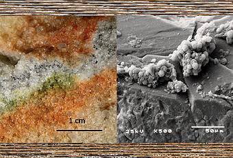 À gauche : section de roche colonisée par des microorganismes cryptoendolithiques ; à droite : Cryomyces dans des cristaux de quartz au microscope électronique — Crédit : S. Onofri et al.