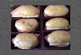 J’ai coupé une pomme de terre en deux, j’ai inséré au milieu de celle ci une tranche de fromage à raclette coupé en deux et deux tranches de bacon. Et, j’ai fait ça pour 6 pommes de terre. Afin que les pommes de terre tiennent correctement, je les ai mises à cuire dans un moule de mini-cakes et hop direction le four à 180° pour 45 minutes.