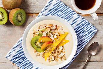 Garniture1 tasse de Nature’s Path Flax Chia Plus® Coconut Chia Granola1 kiwi, pelé et tranché1/2 tasse de pêches tranchées1/2 tasse mangues tranchées1/2 tasse d'amandes rôties tranchées