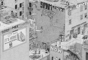 Ses paysages satiriques urbains ultra réalistes de par leurs détails montre que la satire en devient décalée et insolite.