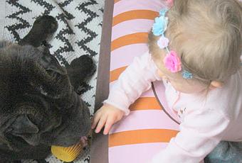 C'est toujours impressionnant et un peu effrayant de mettre un bébé à côté d'un gros chien.On ne sait jamais comment l'un ou l'autre va réagir.Dans notre famille beaucoup sont ceux qui ont peur d'Ariol. Le Shar pei n'est pas le chien qui a la tête la plus amicale du monde, il faut l'avouer.C'est un excellent chien de garde et il a un sacré caractère.