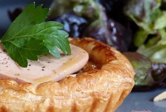 Coupez délicatement des tranches de foie gras, déposez-les sur les tartelettes et servez aussitôt, accompagnées d’une salade verte.