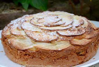 Déposer les tranches de pommes en rosaces sur le gâteau, saupoudrer d'un peu de sucre.