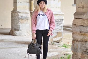 Bon du coup revenons-en au look, je vous ai montré ce bomber sur Snapchat => paris-grenoble et sur Instagram et vous m'avez de vite vous le montrer en look sur le blog afin que vous vous rendiez compte de sa couleur car sur le site il parait très clair, mais en vrai voici sa couleur. Un joli vieux rose satiné vraiment très canon, pour tout vous dire cette veste, j'ai eu un énorme CRUSH, nous marchions sur le boulevard Haussmann avec Alicia pour rejoindre une copine pour le déjeuner, en retard nous marchions très vite et là STOP obligatoire car j'ai aperçu cette beauté dans le rayon qui donnait sur la vitrine. Demi-tour, je pars regarder la bête, le touche, je regarde l'étiquette et le stock en rayon, OK il reste toutes les tailles nous pouvons aller manger mais par contre nous sommes revenues directement après pour que je puisse l'essayer. Un énorme coup de coeur je n'ai pas pu repartir sans, je l'adooooore. Par contre attention il taille assez grand et il se tâche rapidement, mais franchement aucun regret, il change des bombers roses que l'on voit un peu partout en ce moment et en plus il a un côté très Grease et ça j'aime encore plus :)