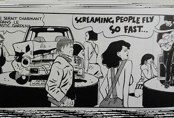 Mais le bonus clin d'oeil se trouve surtout ici dans les quelques cases parsemant l'histoire, où l'on voit tout d'abord, dans le premier hall de présentation, sur une petite scène jouxtant une autre présentant une épave "métal hurlant", un groupe façon garage band sixties, interprétant un titre disant : "Screaming people fly So fast, in their shiny metal cars. Through the wood of Steel and gaz..."
