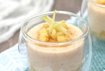 C'est en réalité deux recettes que j'ai imaginées : la première, des gnocchis de pomme de terre ; la seconde (ci-après), une crème toute douce agrémentée de pommes fondantes caramélisées.