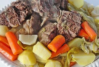 A l'aide d'une écumoire, récupérer les légumes et les dresser dans un grand plat, ajouter les morceaux de viande. Servir aussitôt, en déposant dans une assiette creuse, un morceau de chaque viande et un panaché des légumes, le tout arrosé d'une louche de bouillon. Accompagner avec de la moutarde forte et des cornichons.