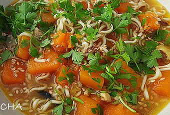 Plonger les cubes de kabocha avec une pincée de sel dans ce même bouillon de poulet et laisser cuire 15 mn , vérifier la cuisson de la kabocha , ajouter ensuite les blancs de poulet coupés en morceaux et les nouilles chinoises , cuire 5 à 10 mn