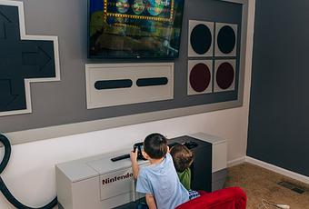 Entre 1983 et 1986, la console Nintendo Entertainment System (NES), envahissait le marché mondial. Devenue un objet de collection pour les retrogamers, la console NES est ici au centre d’une décoration d’une salle de jeux. La manette géante devient un habillage mural pour écran TV et la console est camouflée dans un vrai meuble de rangement. Une réalisation soignée pour une pièce dédiée qui va faire rêver les amateurs du genre.
