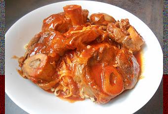Ingrédients pour un ossobuco pour 4 personnes : 4 morceaux de jarret de veau 4 os à moelle pour les amateurs (facultatif)1 boîte de concentré de tomate1 oignon coupé finement 2 gousses d'ail1 verre de vin blanc sec1 verre d'eau 1 c à c de cumin1 feuille de laurier (facultatif)un peu de farine sel et poivre