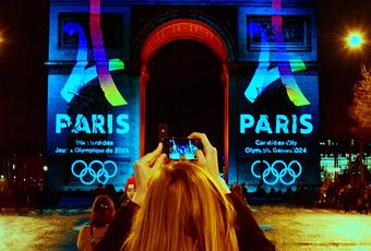 Le logo de la ville de Paris pour la candidature des Jeux Olympiques d’été de 2024 a été dévoilé mardi soir symboliquement à 20h24 sur la façade de l’Arc de Triomphe.