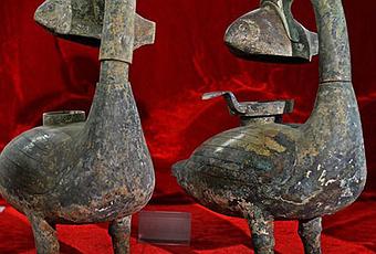 Photo prise le 6 novembre 2015, montrant les deux lampes en bronze mises au jour lors des fouilles de la tombe royale du Marquis de l'état de Haihun sous la Dynastie des Han de l'Ouest (206 avant JC - 25 après Jc) à Nanchang. [Photo/Xinhua]
