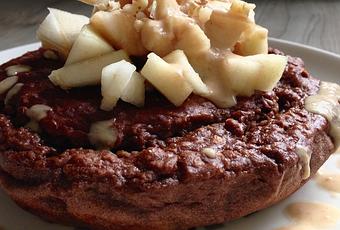 La touche gourmande: Comme sur la photo, j'ai décidé de l'acompagner de morceaux de poire, de beurre de cacahuète dilué dans de l'eau et de quelque éclats de noix.