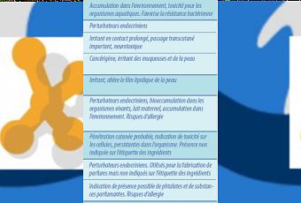 Enfin, l’Ethylène diamine tétraacétique (EDTA), un agent chélateur puissant, s’avère très présent dans les produits moussants (shampoings et bains), les sulfates (laureth et lauryl sulfate), des agents moussants associés à des risques d’irritation et d’autres agents toxiques sont également mis à l’index par ce rapport.