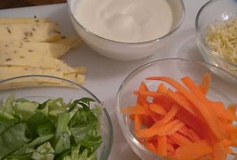Disposez les fonds sur la grille du four recouverte de papier d'aluminium et garnissez-les de salade, de carotte, puis de la moitié des lamelles de gouda. Reservez.