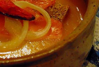 ... on garnit d'un croûton de bon pain grillé et frotté d'ail... et recouvert de fauxmage oignon... avec quelques fines rondelles d'oignon ...
