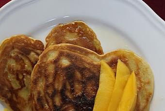 Voici les pancakes que j’ai fait hier matin (aucune anticipation, cette fois !). Je me suis amusée à leur donner la forme de cœurs, et cela a contribué au fait que nous avons commencé la fête de la Saint Valentin d’excellente humeur. Leur présentation a été aussi appréciée que leur saveur « exotique », car nous aimons beaucoup le triptyque mangue - noix de coco - citron vert. Cette association est très agréable et très équilibrée, et je la trouve parfaite pour la saison (ainsi que pour l’occasion !). L’idée vient de « Gordon Ramsay’s ultimate cookery course » : j’ai pris sa recette pour le sirop de lime (en diminuant la quantité du sucre, mais c’est une question de goût) et son idée d’accompagnement de mangue fraîche. Cependant, j’ai utilisé ma propre recette de pancakes, en ajoutant 2 bonnes cuillères de crème de noix de coco dans le mélange ; puis, j’ai fait cuire les pancakes avec huile de coco.