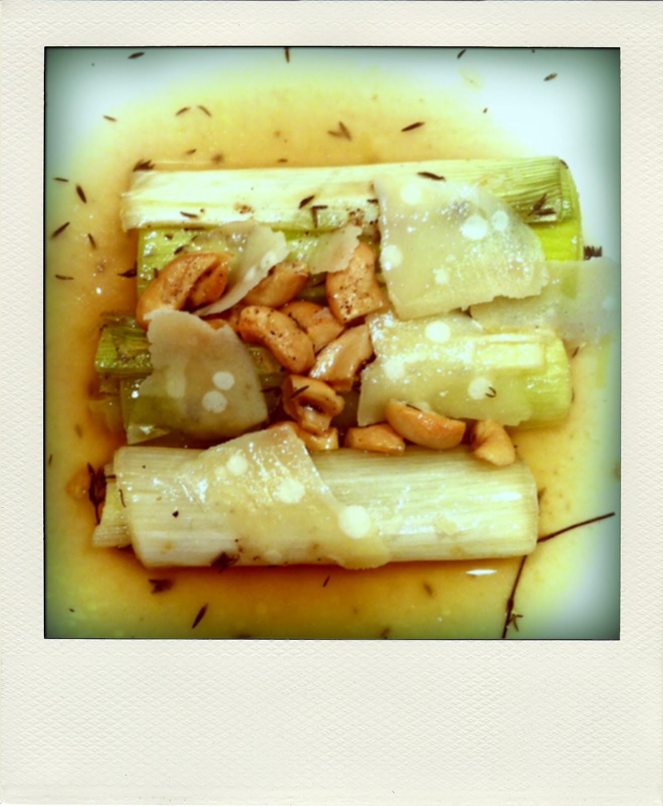 Préchauffez le four à 180°C. Préparez votre bouillon. Déposez les poireaux dans un plat allant au four. Salez et parsemez de thym. Déposez quelques morceaux de beurre sur les poireaux et versez le bouillon. Enfournez et arrosez les poireaux pendant la cuisson, environ 30 minutes. Faites griller les noix de cajou. Une fois les poireaux sortis du four, parsemez de noix de cajou et de copeaux de parmesan. Poivrez. Enjoy! Bises!
