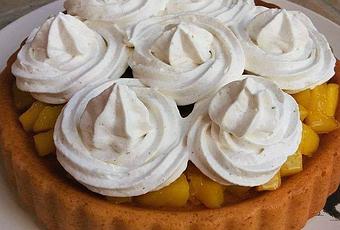 Placer ensuite la crème fouettée dans une poche à douille et la répartir harmonieusement sur les morceaux de mangue.