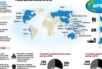 Rappelons que l'APEC a été créée en 1989 dans le but d'assurer une croissance inclusive et novatrice des pays membres ; en particulier en réduisant les barrières commerciales, en promouvant les exportations, et en créant en 2020 un système de commerce transparent et libéral. Grâce à l'APEC, le Pérou a augmenté ses exportations vers la Chine (30%), les USA (30%), le Canada (29%) ; le pays importe des produits des États-Unis (33%), de la Chine (32%), du Canada (29%) et du Mexique (7%).