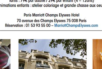Le dimanche 27 mars 2016, le Paris Marriott Champs Elysees vivera au rythme des festivités pascales. Quelques lapins et oeufs viendront s'ajouter subtilement à la décoration de l'hôtel pour surprendre les clients. En cuisine, les chefs concocteront des mets phares de Pâques pour célébrer cette fête dans la tradition. Ils inviteront également les convives à plonger dans l'univers passionnant du cacao avec de merveilleuses créations chocolatées. Ce délicieux brunch pourra, si le temps le permet, être dégusté en extérieur sur la terrasse de l'hôtel.