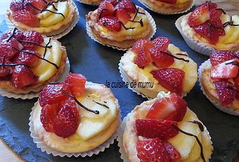 Garnissez les tartelettes avec la crème pâtissière, mettez 2 tranches de pommes et les fraises